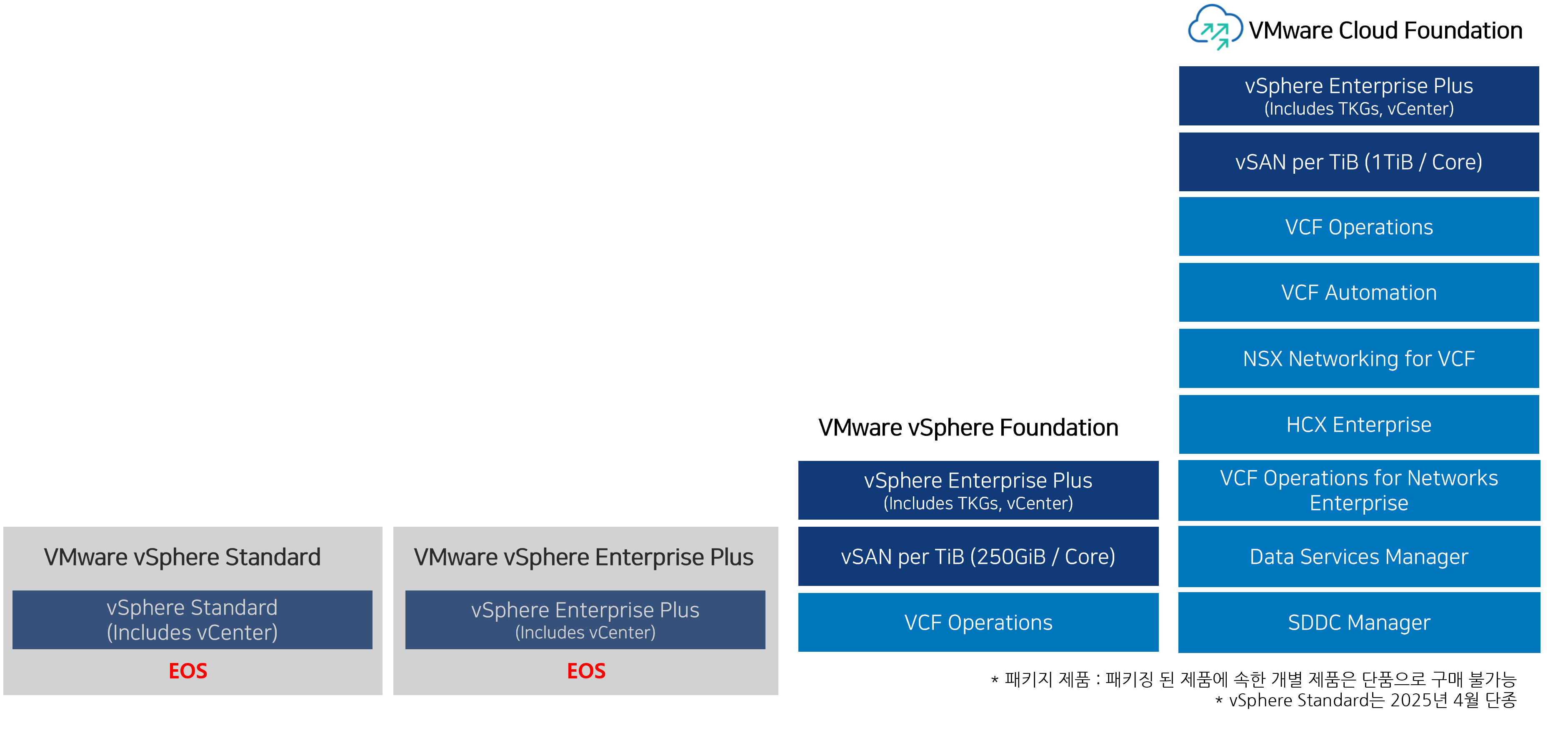 - 제품 구성 변경으로 NSX, vSAN, Aria, Tanzu 등의 제품군은 단독으로 구매 불가하며, VMware Cloud Foundation, vSphere Foundation 제품 구매 시 Add-On으로 구매 가능